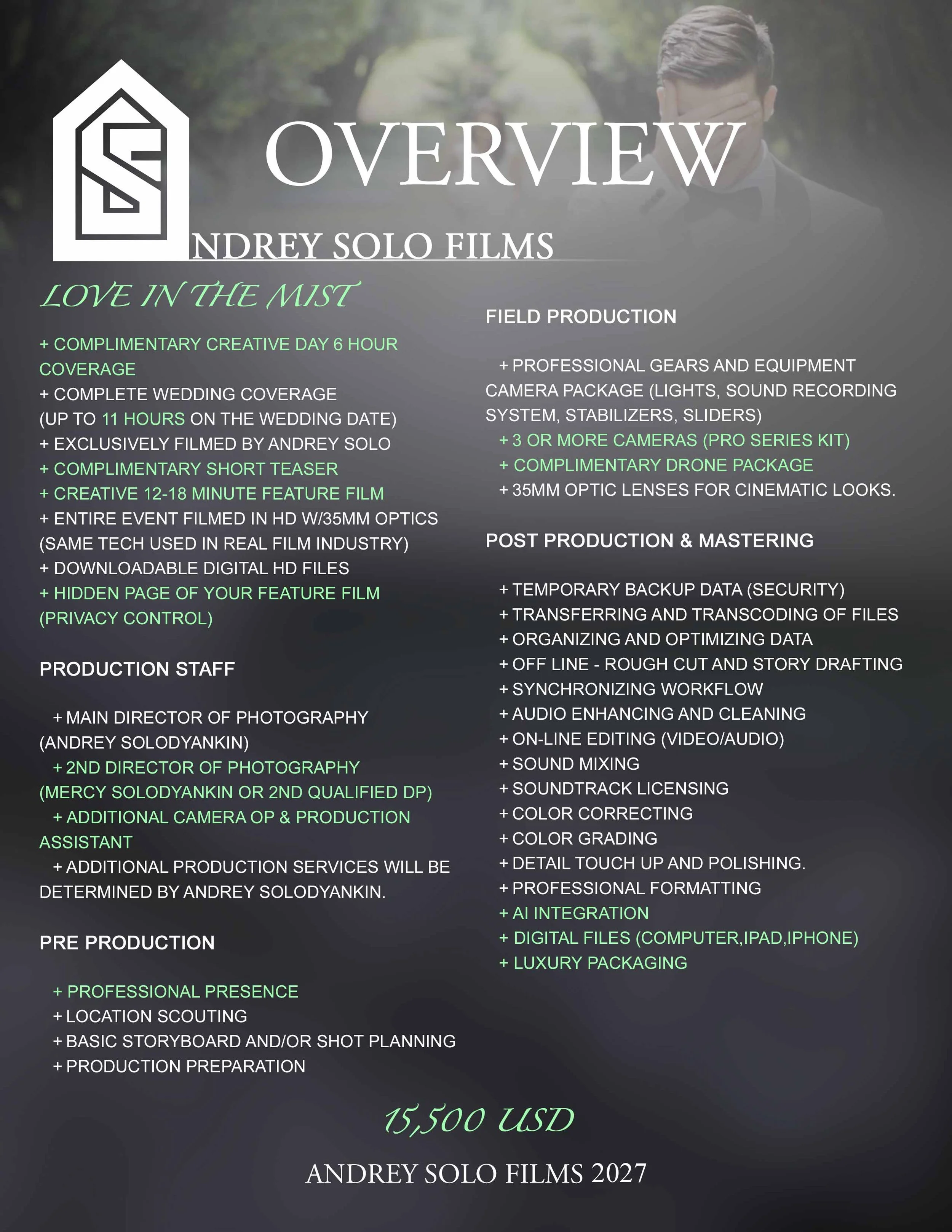 ~ Booking requires minimum of 50% of the total to solidify date with Andrey Solo Films. Remaining will be due two weeks prior wedding date.
