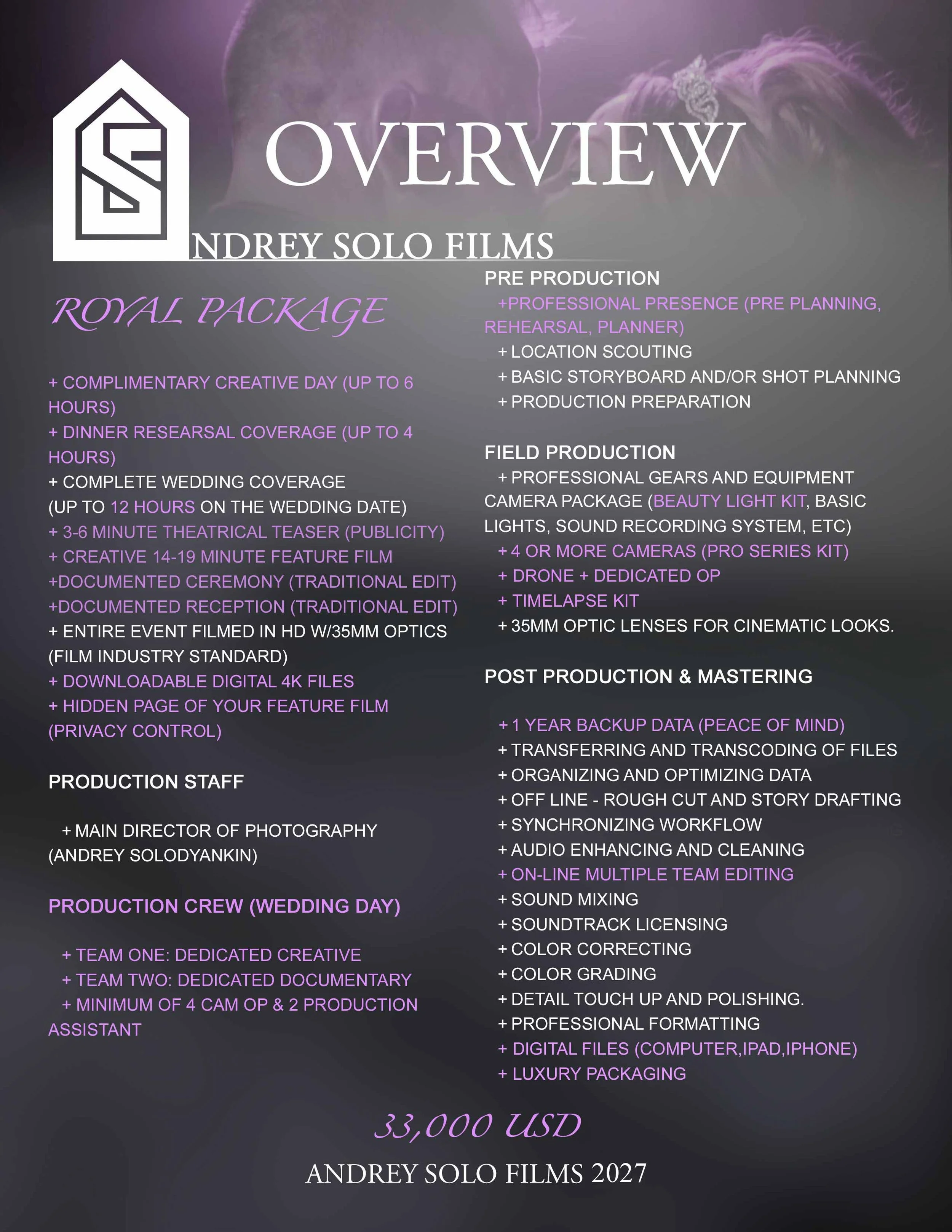~ Booking requires minimum of 50% of the total to solidify date with Andrey Solo Films. Remaining will be due two weeks prior wedding date.
