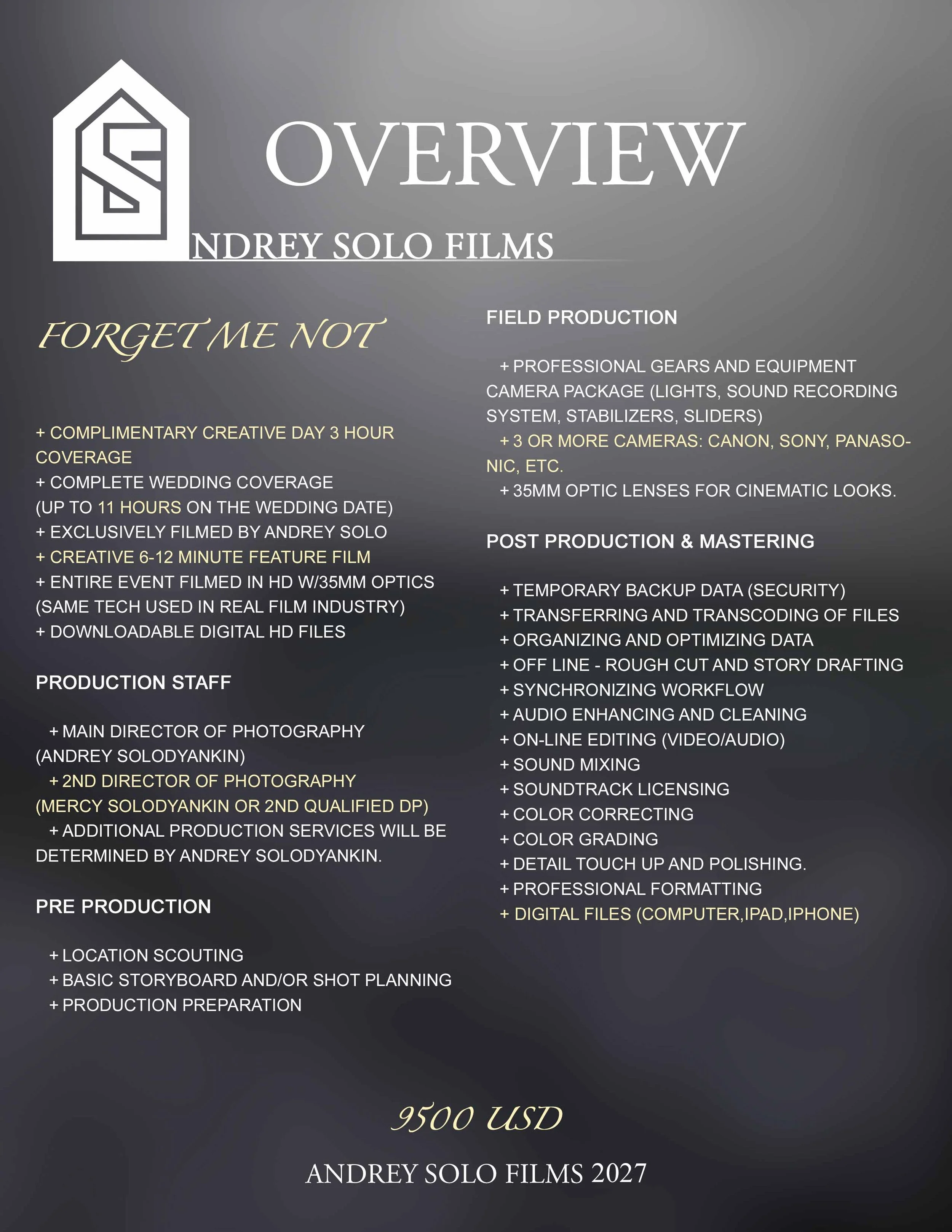 ~ Booking requires minimum of 50% of the total to solidify date with Andrey Solo Films. Remaining will be due two weeks prior wedding date.